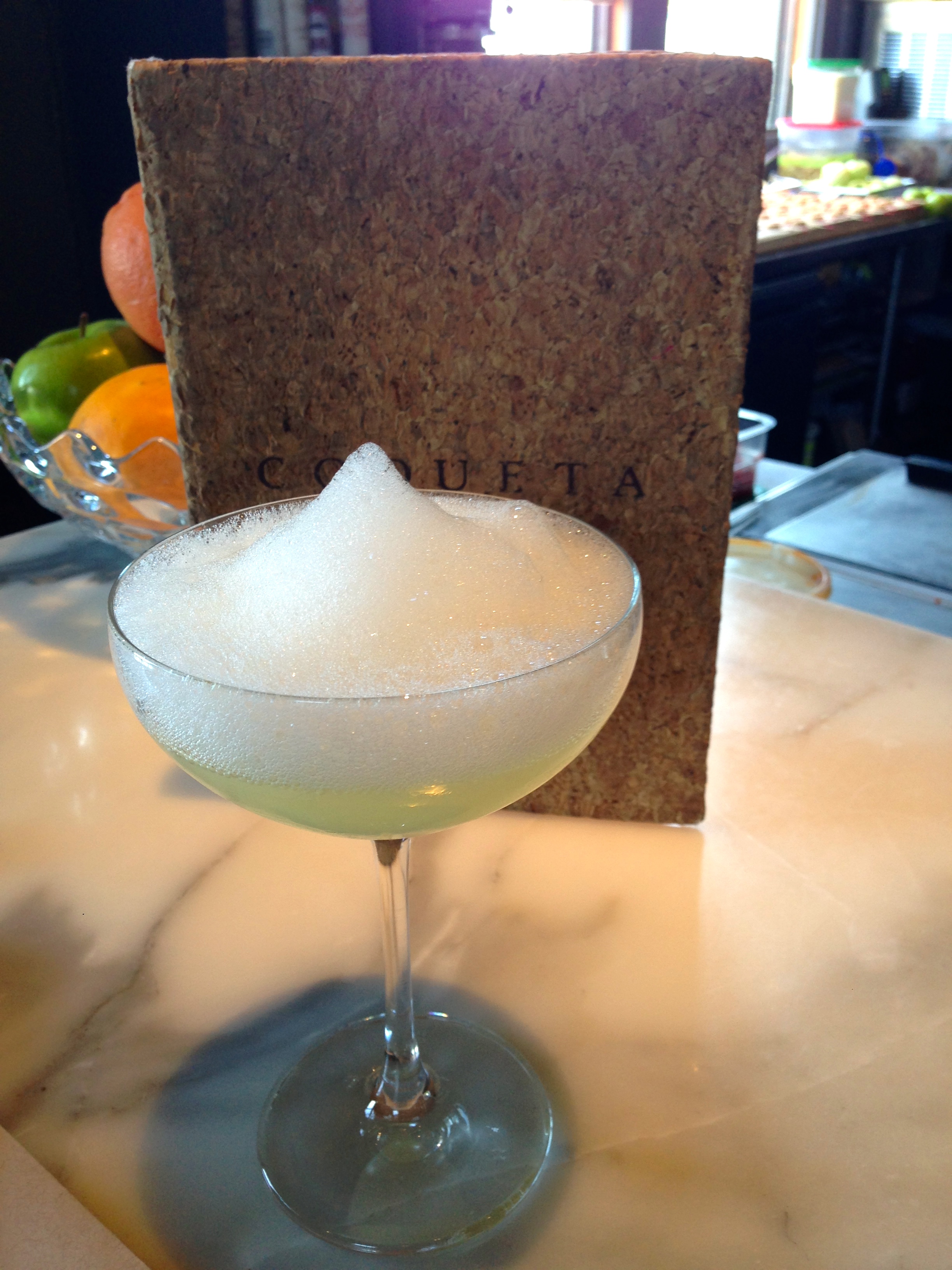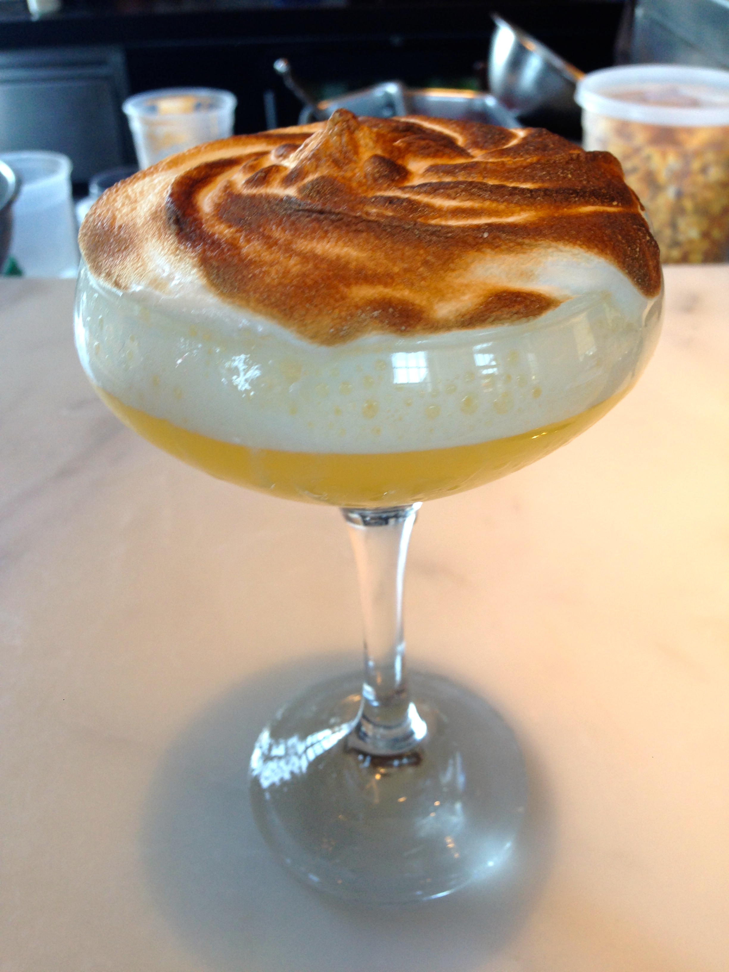 The Sun Never Sets. Licor 43, Tequila 123 Anejo, Lime, Fresh Pressed Pineapple Juice, and Mezcal-Pineapple Espuma Brulee.