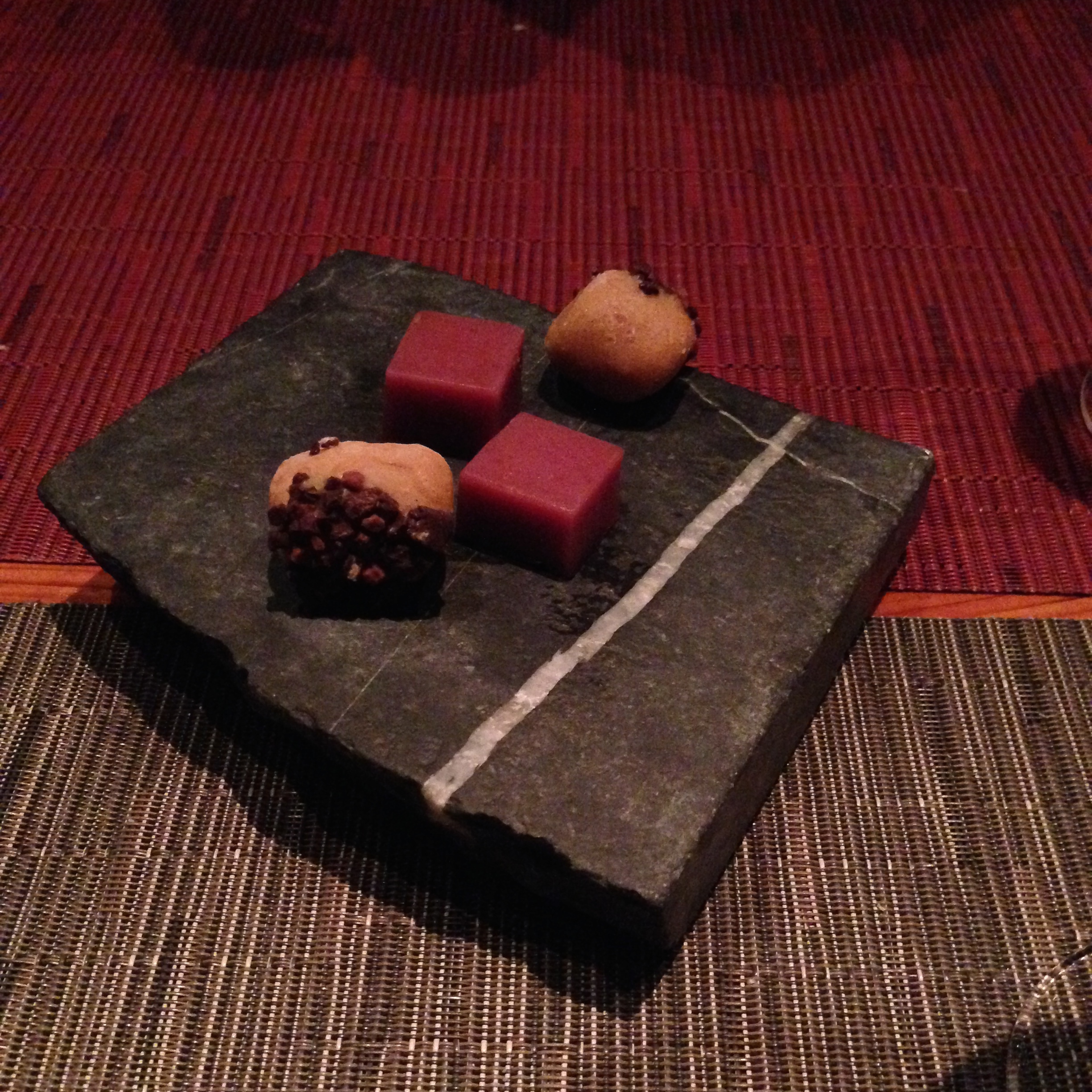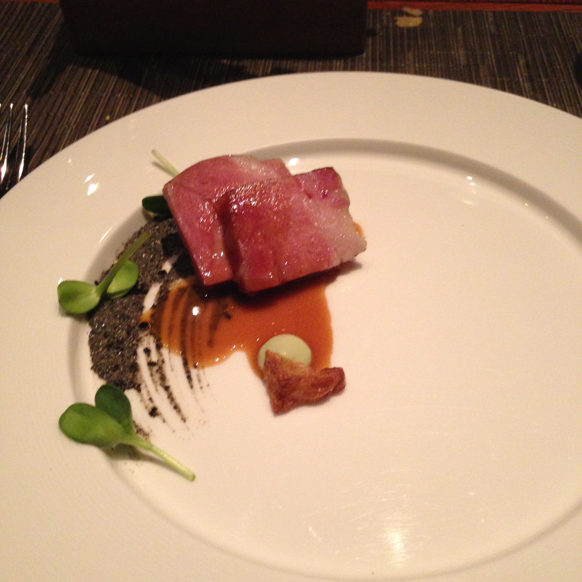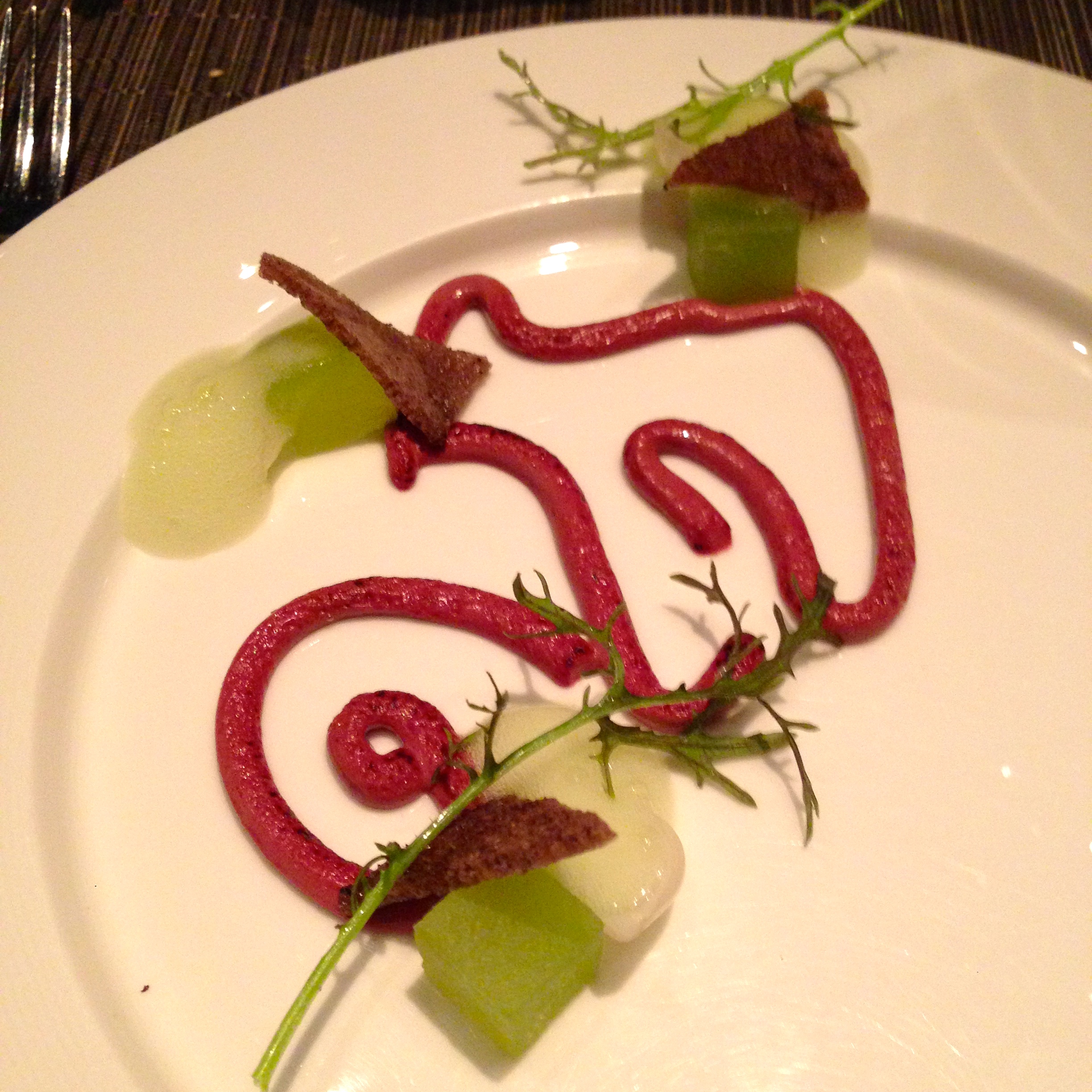 Oyster in its “shell”, preserved lemon, snow pea, hazelnut. It didn’t start off well. We asked what kind of oyster we were being served, and that was apparently too much to ask, because we received a couple of different answers. Our server eventually had to consult with the chefs in the kitchen before he triumphantly told us that this was a kumamoto oyster. Okay, I was surprised. “It doesn’t taste like a kumamoto oyster,” I commented. It was hard for me to tell what type of oyster it was without the shell, but it didn’t have the sweet taste and smooth texture of kumamoto oysters I had had in the past. Our server was indignant, though, and offered to have the chef come over to the table and verify that the oyster was a kumamoto oyster in a patronizing tone. “No thanks”, I said. I’ll just assume that the oyster wasn’t fresh.