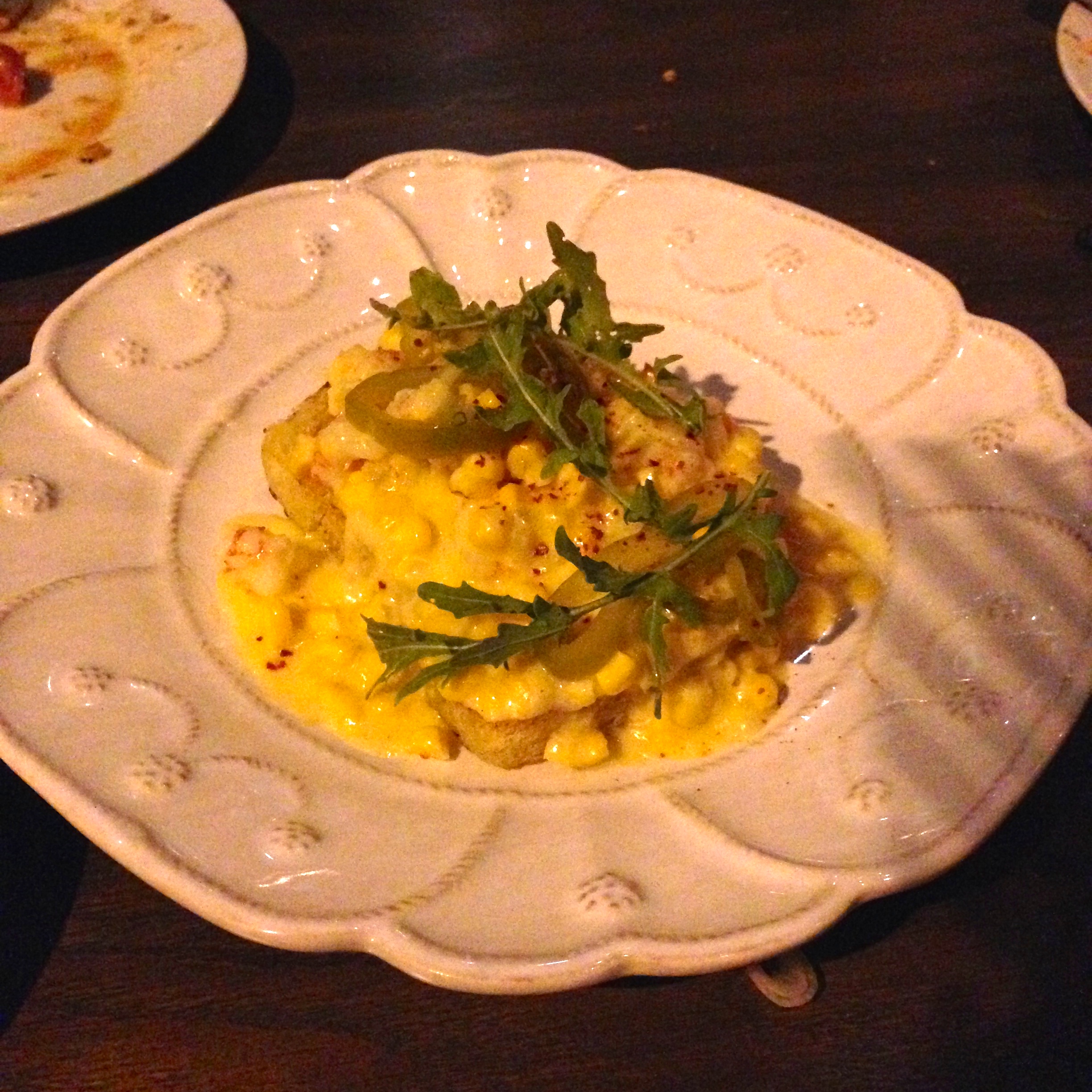 Shrimp and grits toast. Oregon bay shrimp, creamed corn, pickled peppers. After another 10 minutes, our next course appeared. The shrimp and grits toast was too rich and creamy for me, but my friends enjoyed it.