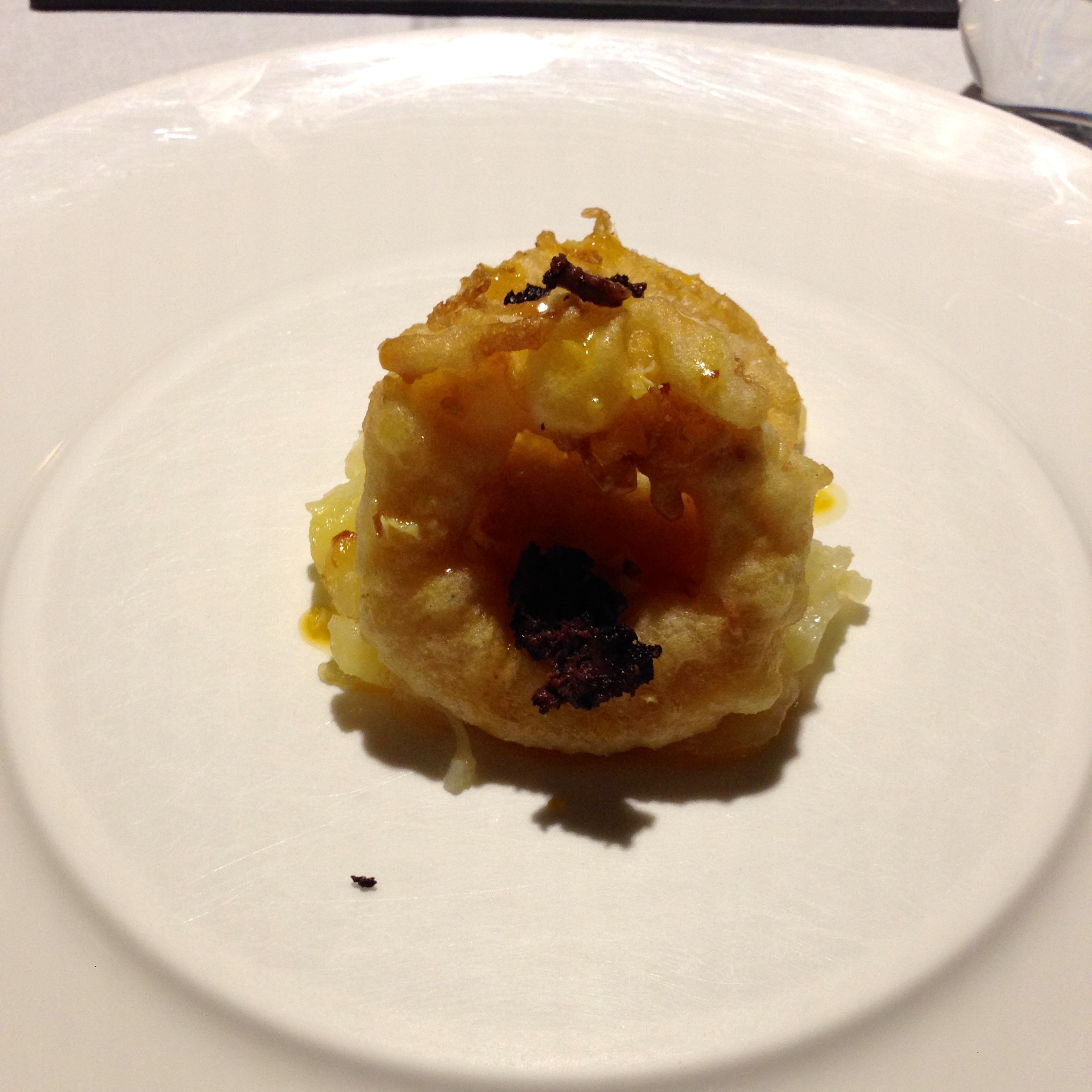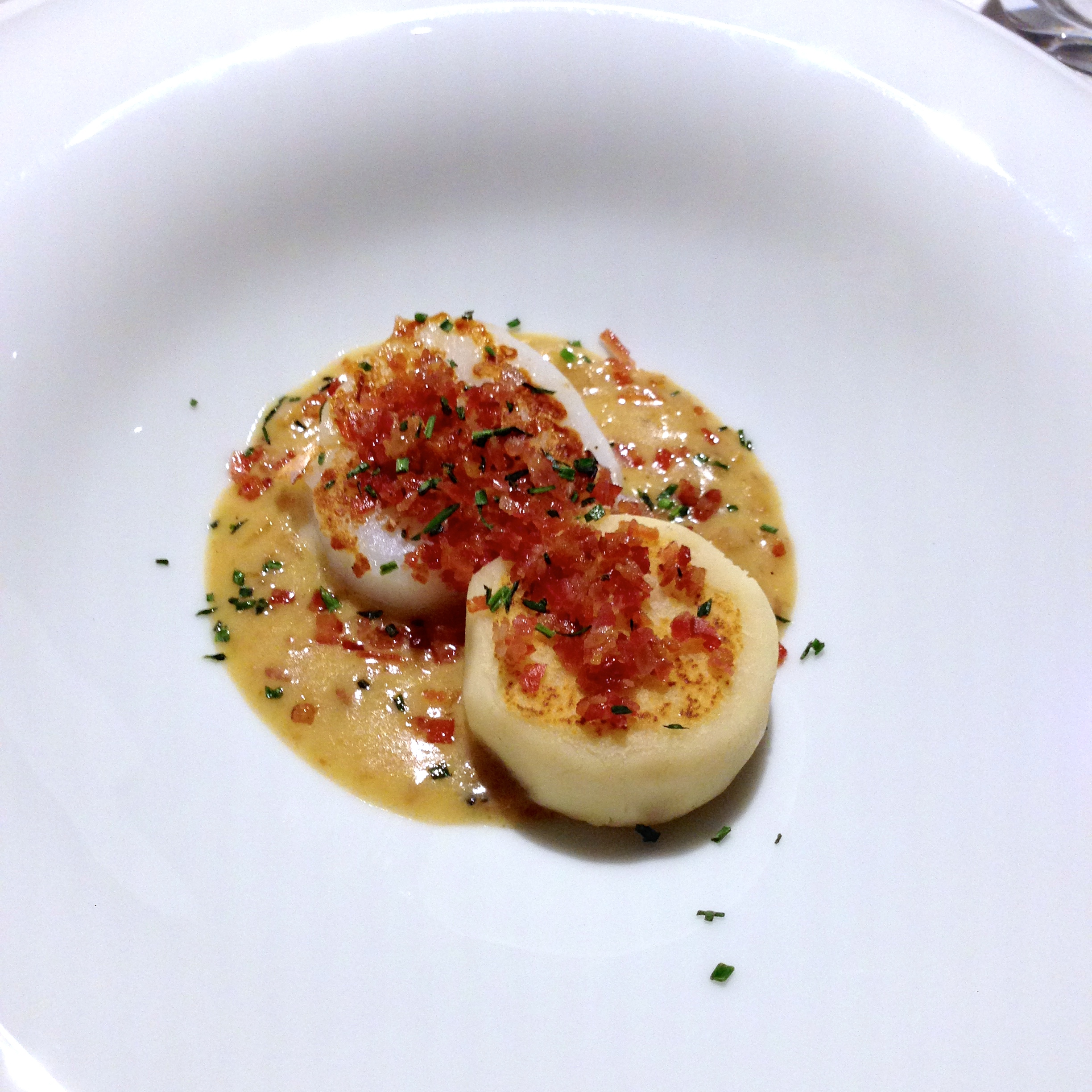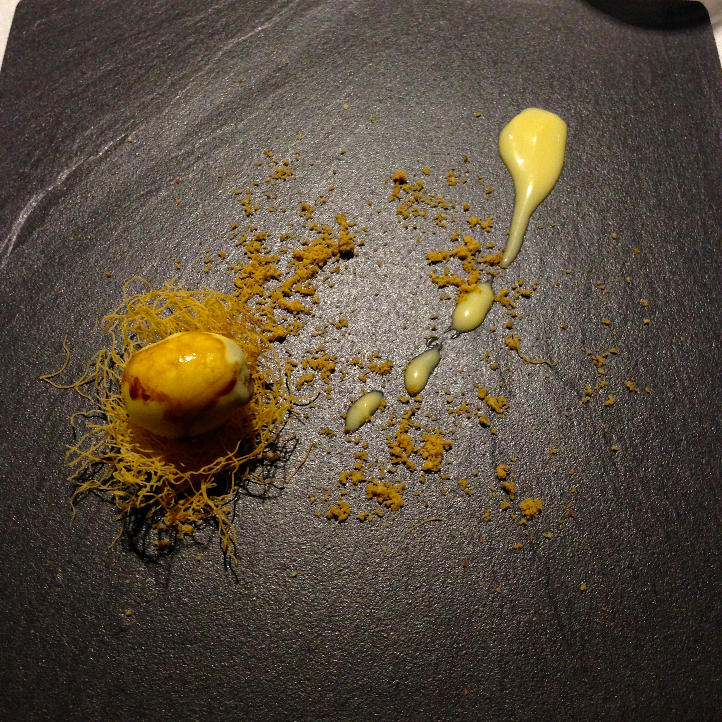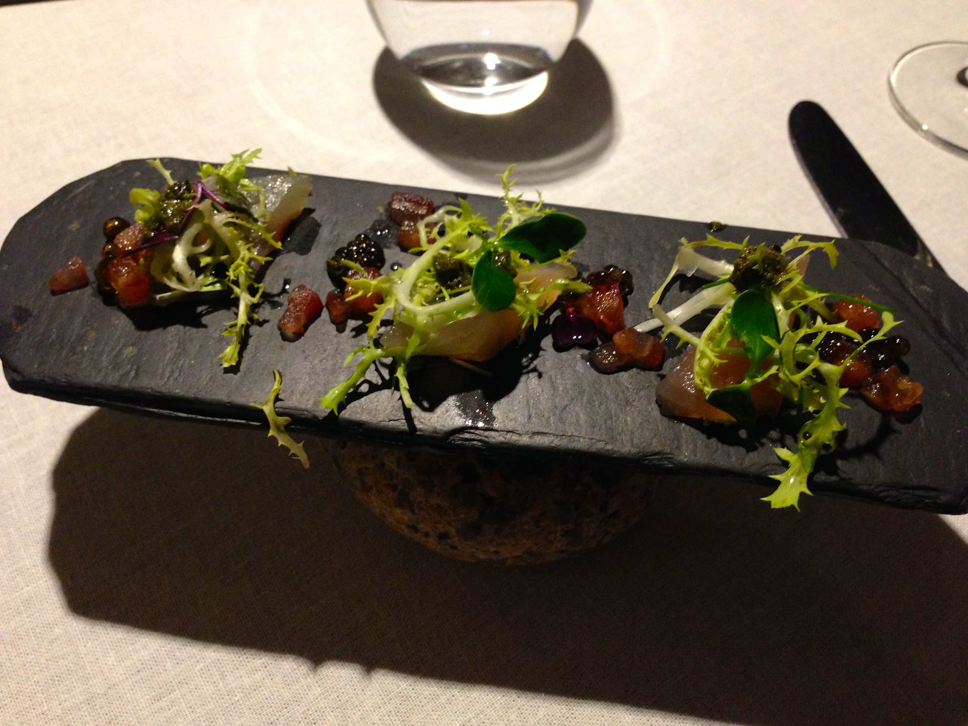 Salami “sand” amuse bouche with tomato. I really enjoyed this amuse bouche. The salami was tasty, with an interesting mix of salty and sweet flavors.