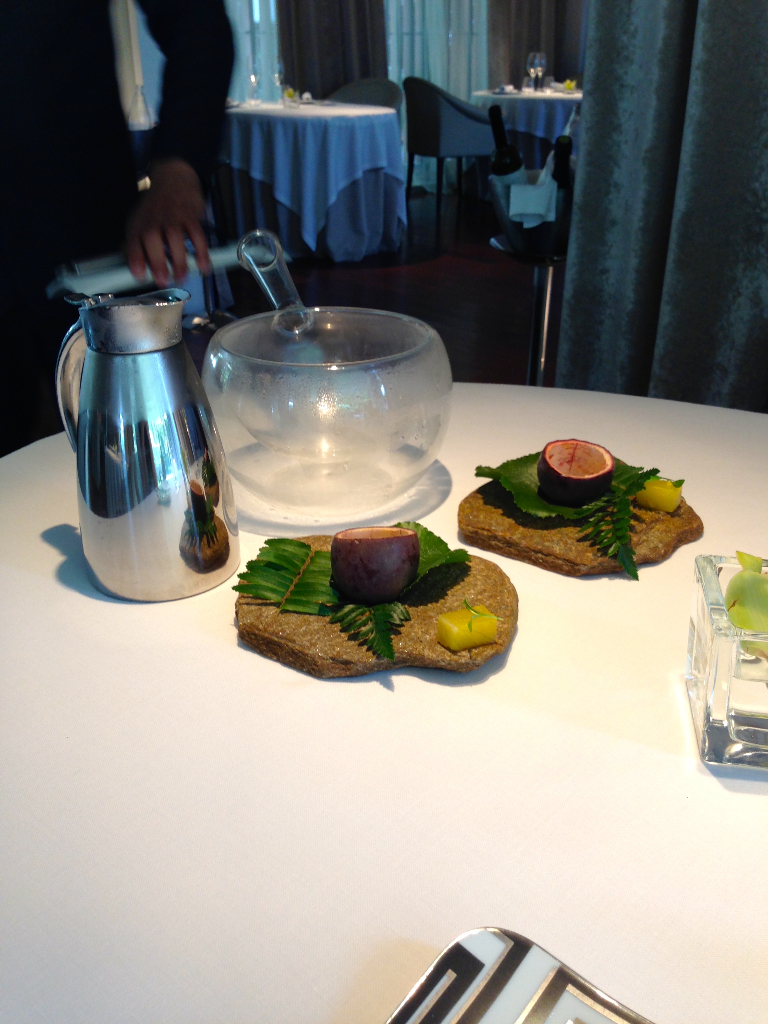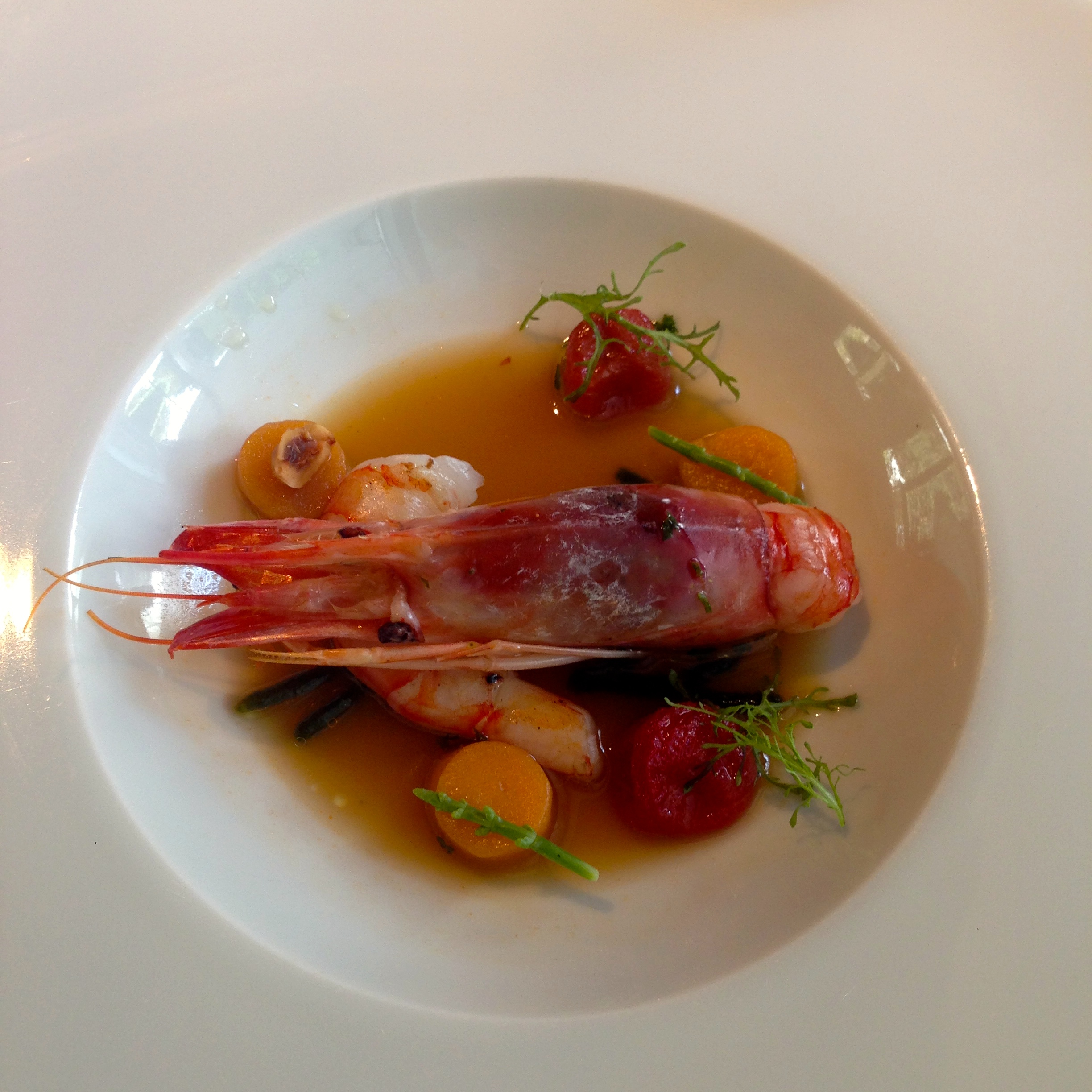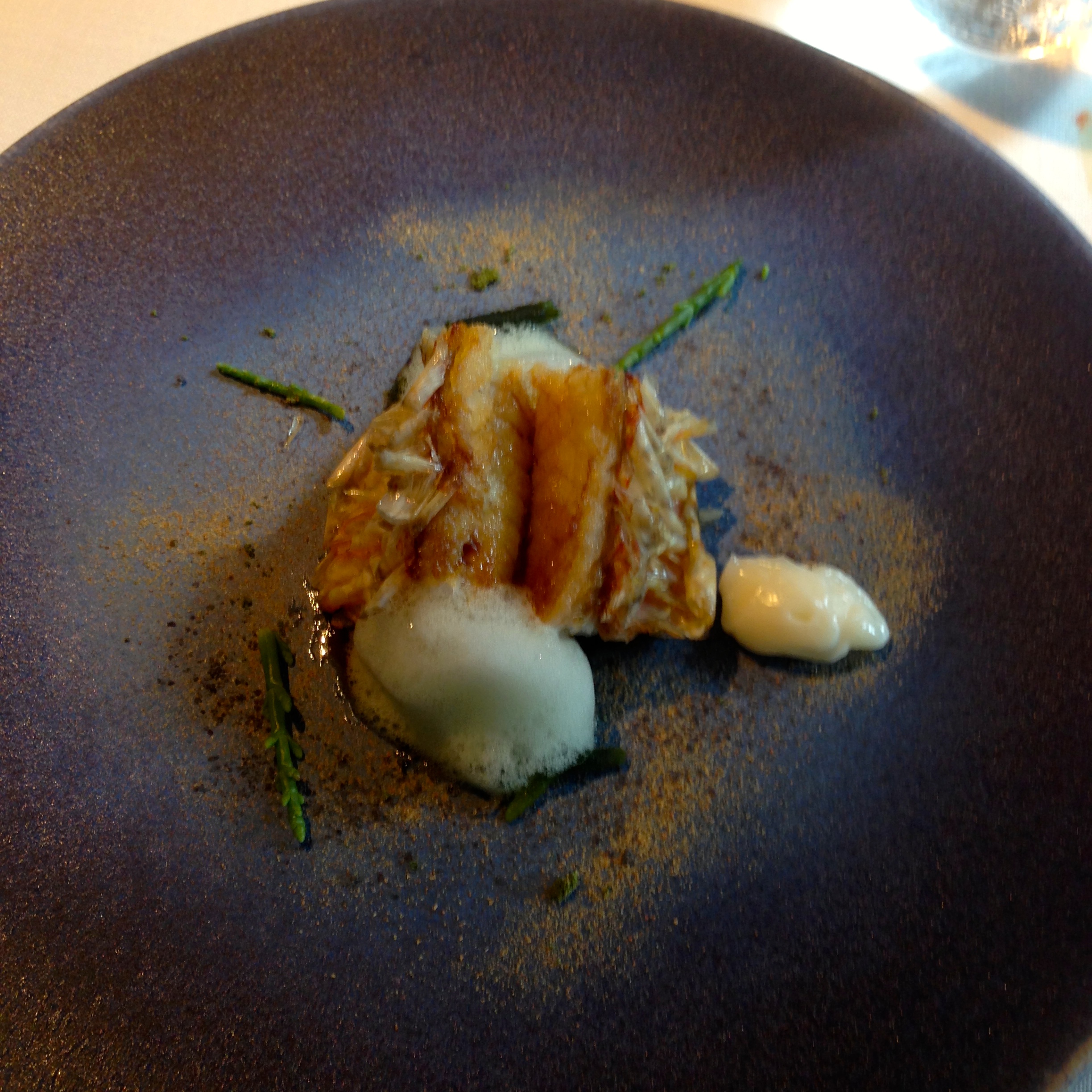After our cocktails, we were escorted to our table indoors. The overall feel of the restaurant is contemporary, with modern furnishings and elegant yet simple decor. We decided to go with the ABaC tasting menu, which was 135 euros per person. Let’s just say that this is one of those tasting menus that will challenge your eating ability. By the 9th course, I was sufficiently full, but I pressed on and (somewhat) successfully finished my meal.