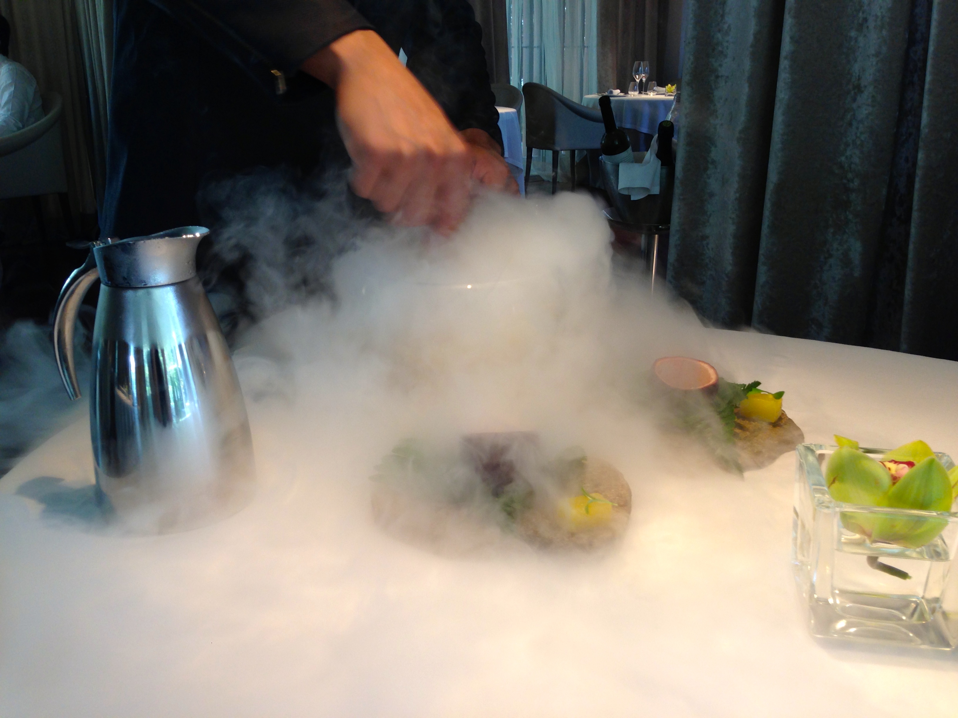 Making of the passionfruit mojito, part 1. Our server prepared a passionfruit mojito for us to start off our meal with liquid nitrogen and fresh fruit.