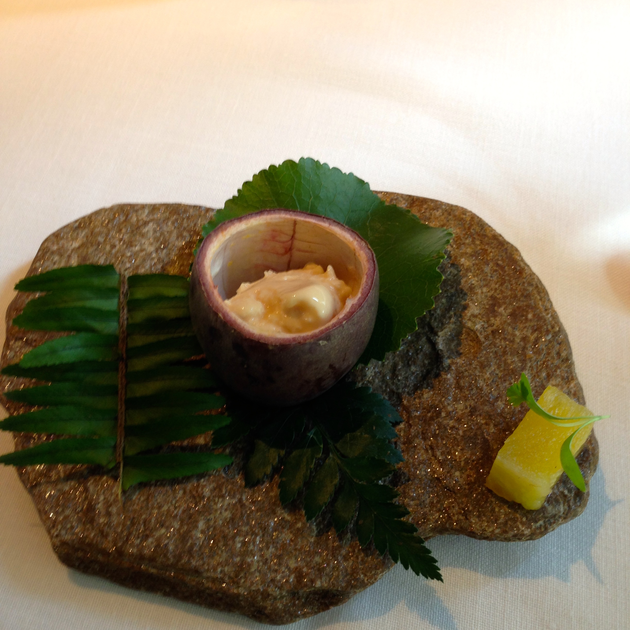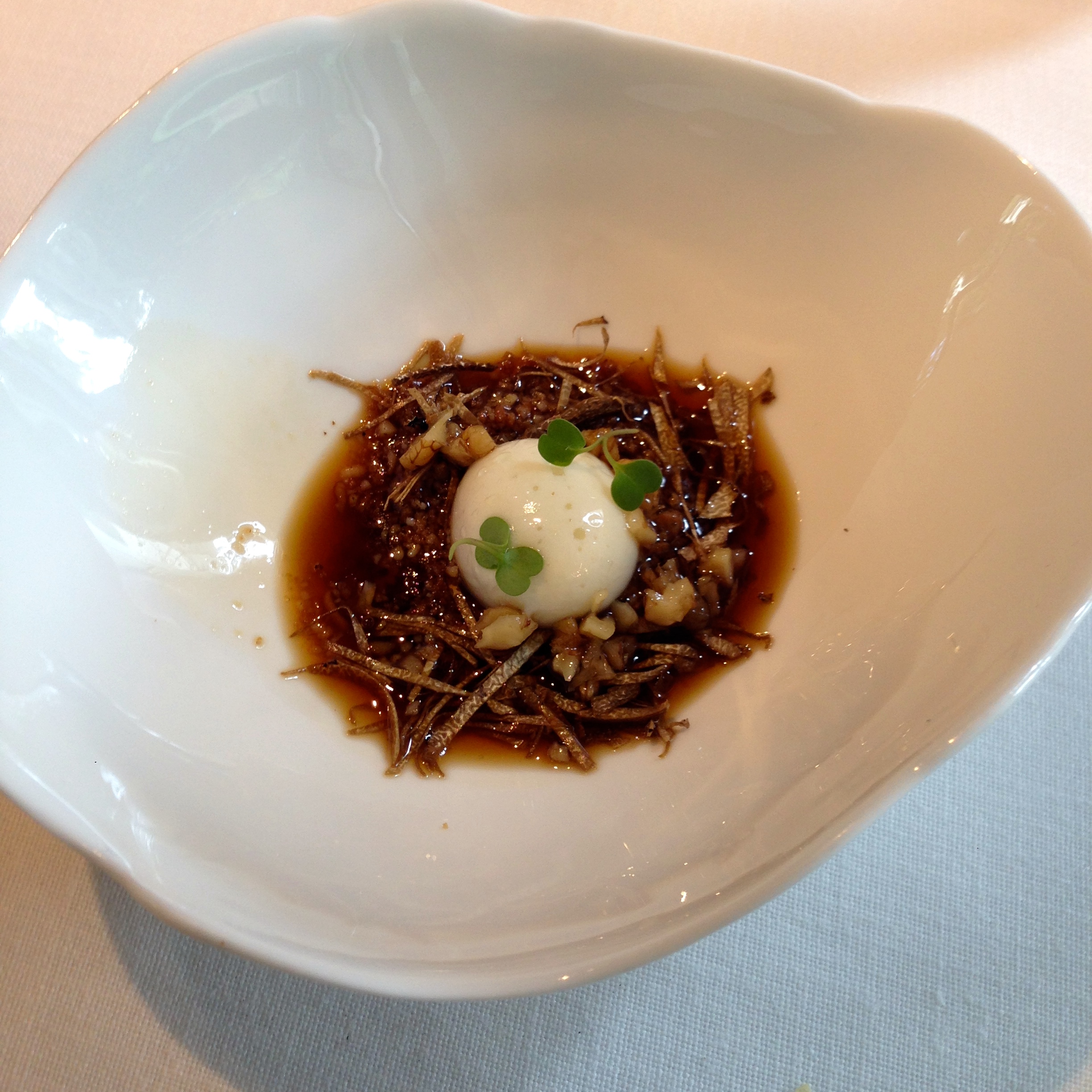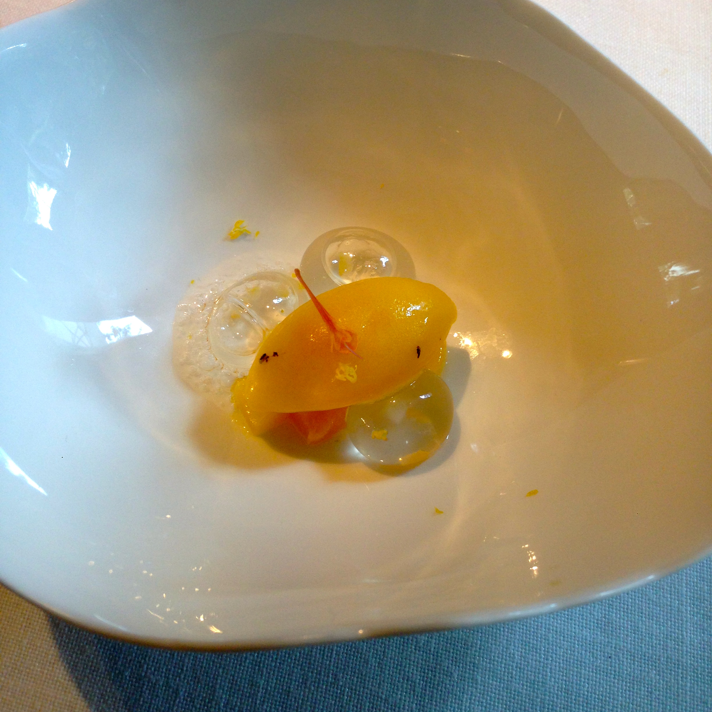 Tonic water bubbles with mango, candied lemon and juniper. I really enjoyed this interesting palate-cleanser type dish. The tonic water bubbles popped in my mouth with a slight bitter taste but it was immediately set off by the sweetness of the mango.