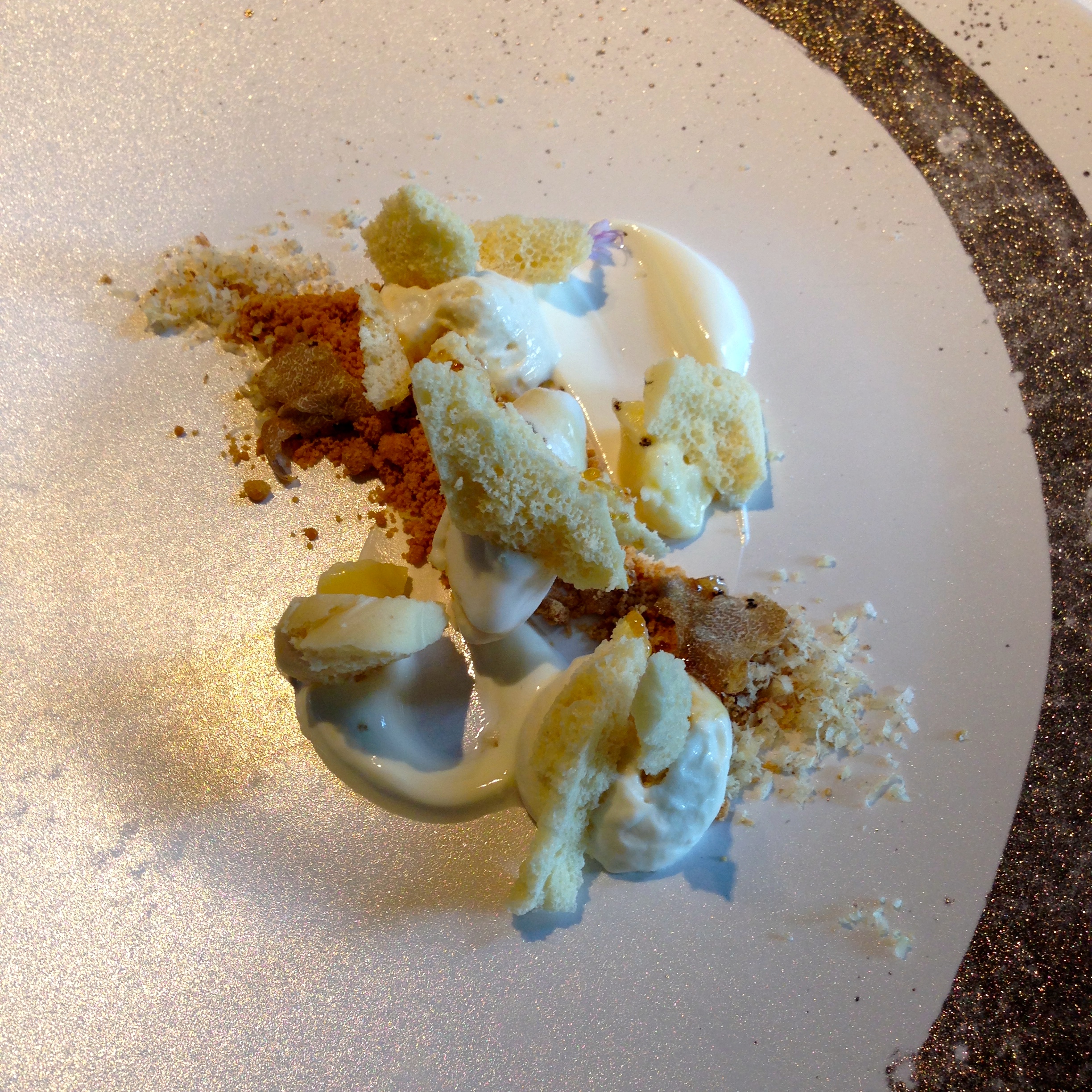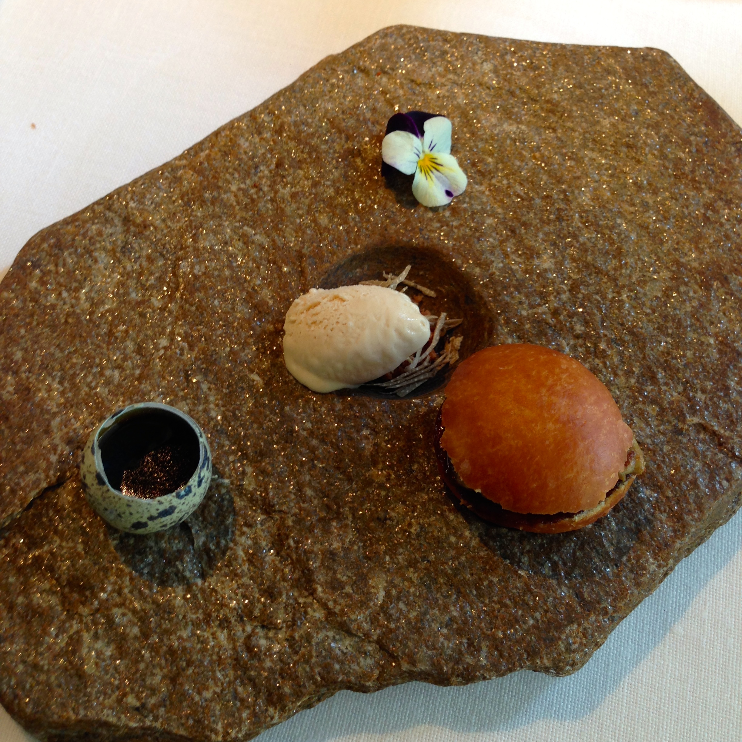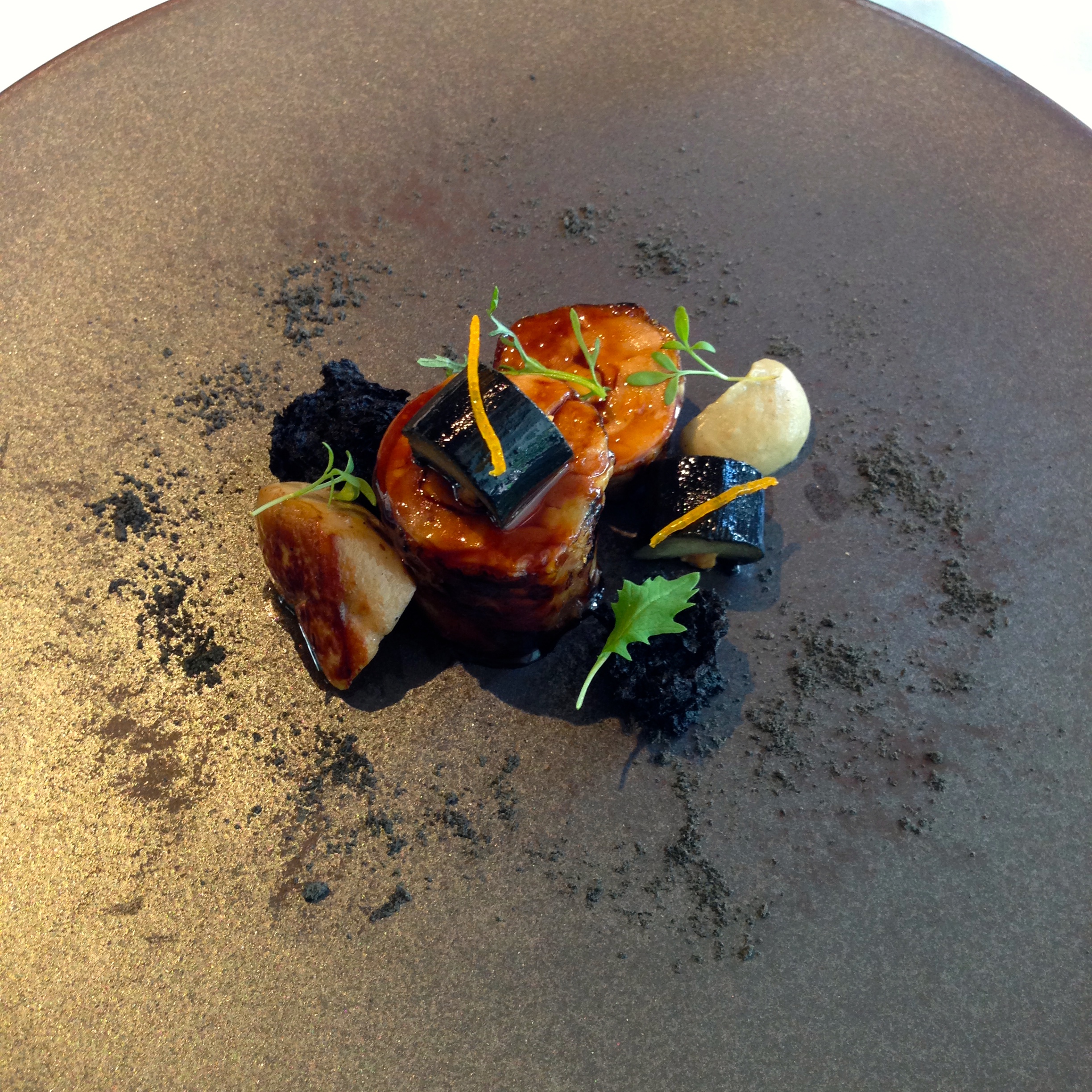 Guinea fowl with foie gras, aubergines textures, black garlic and kumquat. I have to admit that by this point in the meal, I was really full and overwhelmed by the richness of the guinea fowl stuffed with foie gras. I was ready for the dessert courses.
