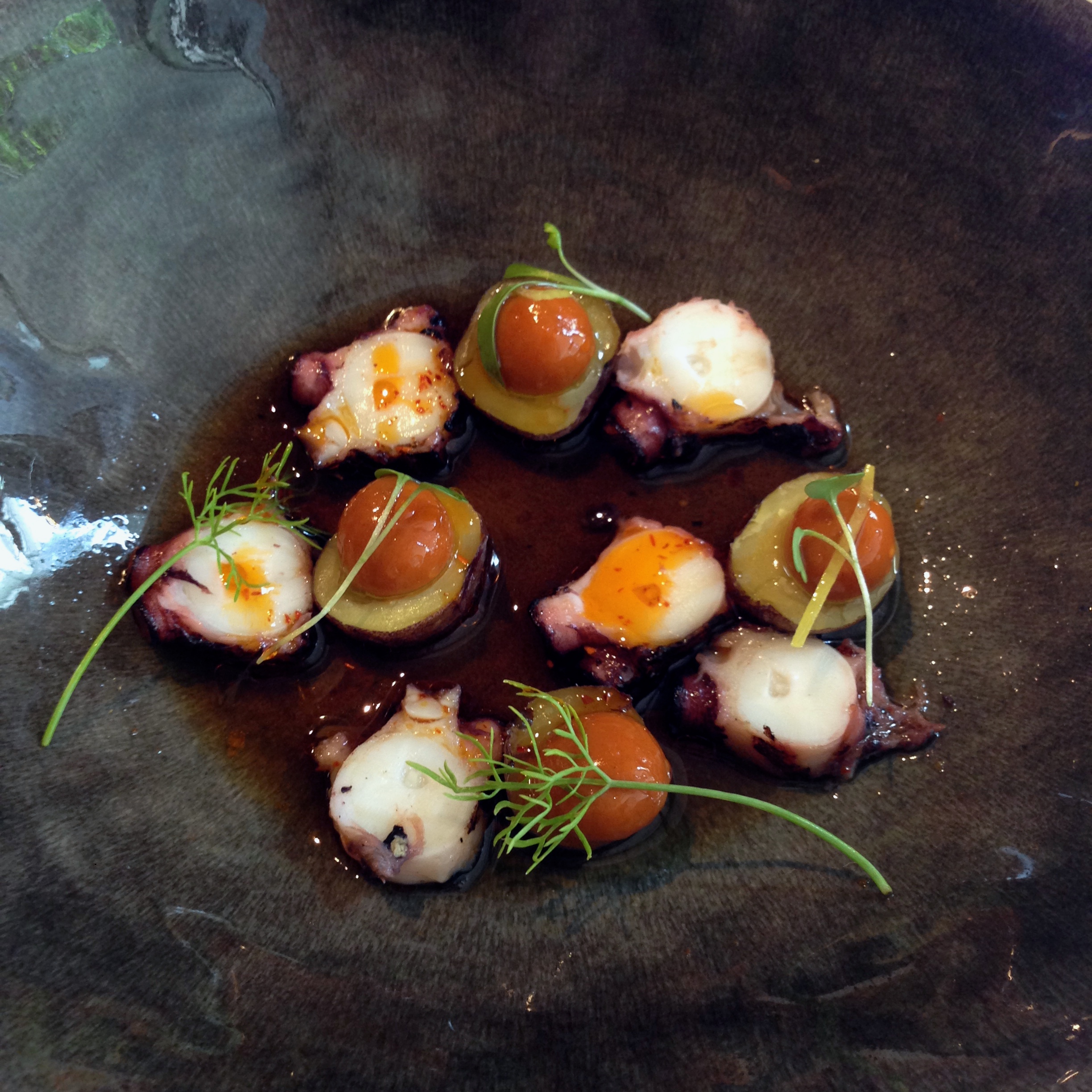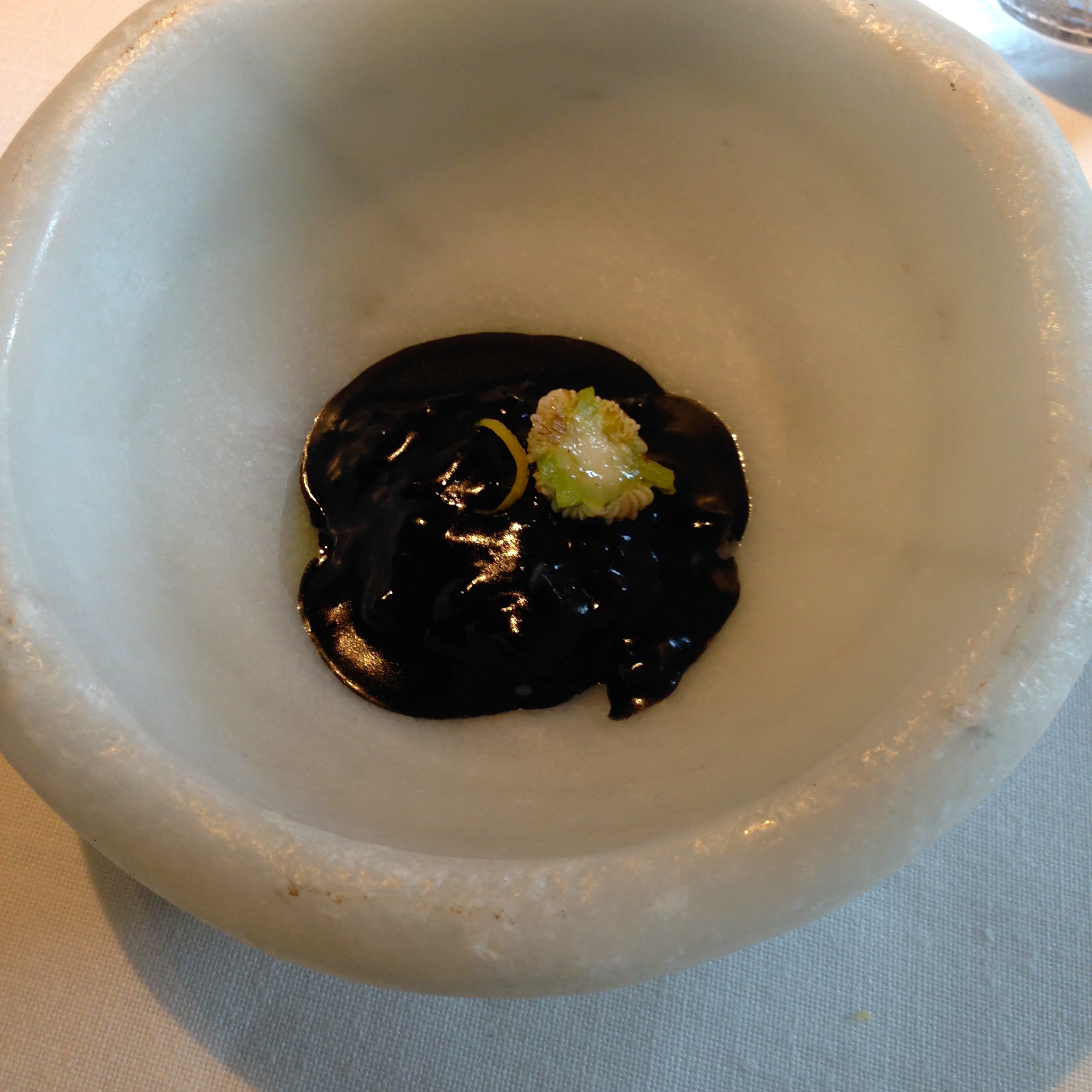 Squid treated like black rice with padron seeds. Normally I am a fan of squid ink-type dishes, but this gooey rendition was rather bland and lacked texture.