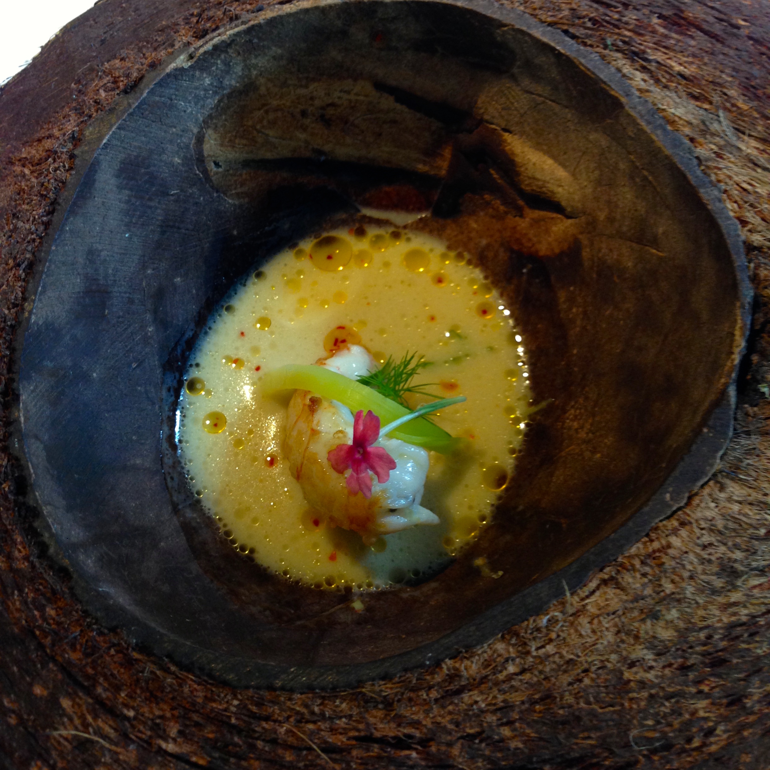 Small langoustine and young leeks with coral juice and Thai coconut. If you dine at a lot of Spanish fine dining restaurants, you’ll start to notice that langoustine is almost always on the menu. This particular variant was fresh and tender, and the Thai coconut-infused broth added an extra spicy kick to the dish.